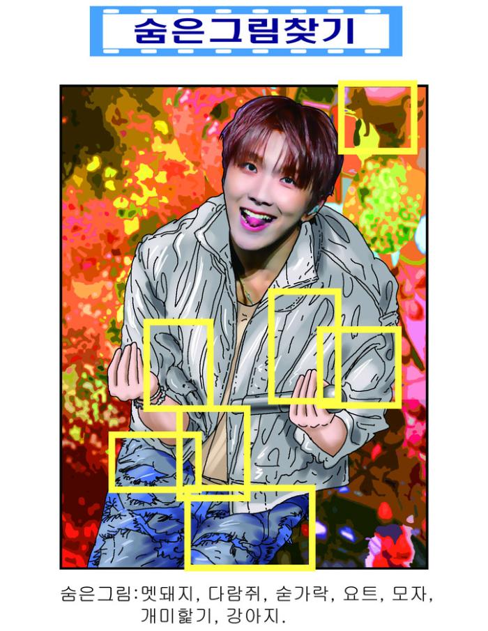 숨은 그림 : 멧돼지, 다람쥐, 숟가락, 요트, 모자, 개미핥기, 강아지.