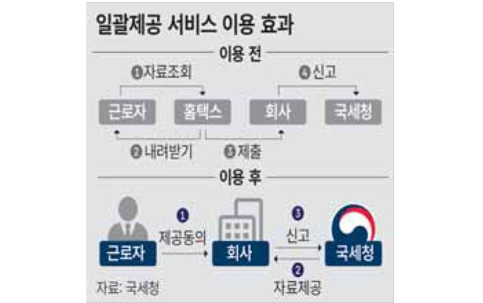 근로자는 다음 달 1일부터 내년 1월 15일까지 홈택스 또는 손택스에서 자료 제공 대상 회사와 제공 범위를 확인(동의)하면 절차가 완료된다. 같은 회사에 재직할 경우 매년 새로 동의할 필요는 없다. 동의 후에도 일괄 제공을 원하지 않을 때는 홈택스에서 동의 여부를 취소하면 된다.