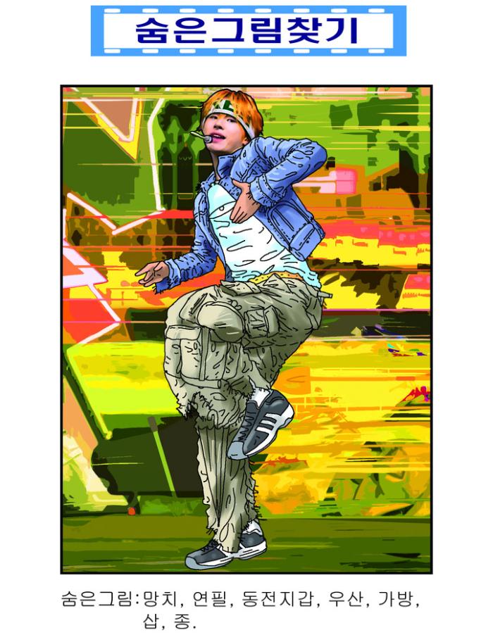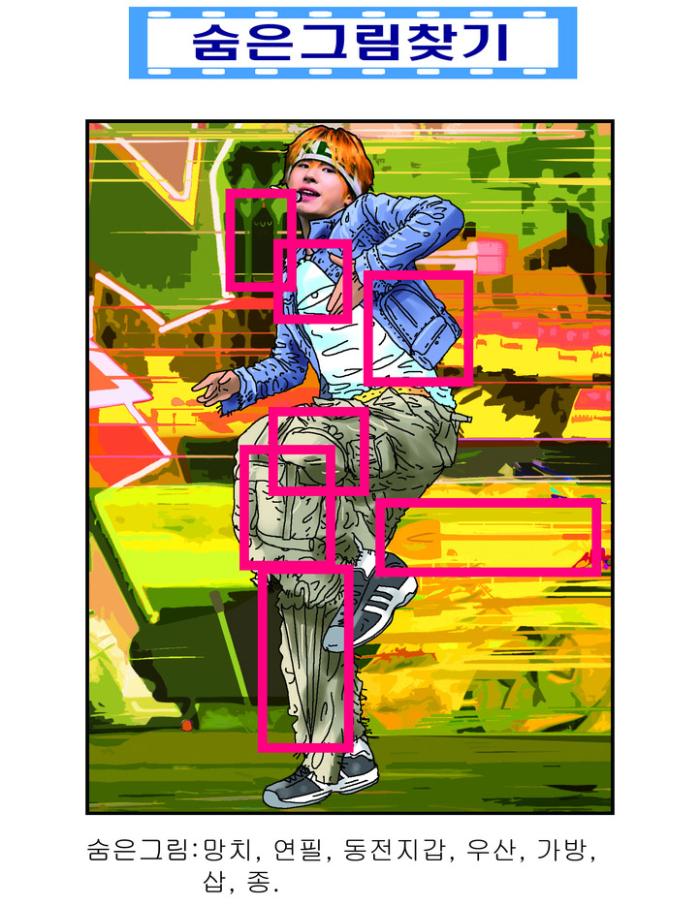 숨은 그림 : 망치, 연필, 동전지갑, 우산, 가방, 삽, 종