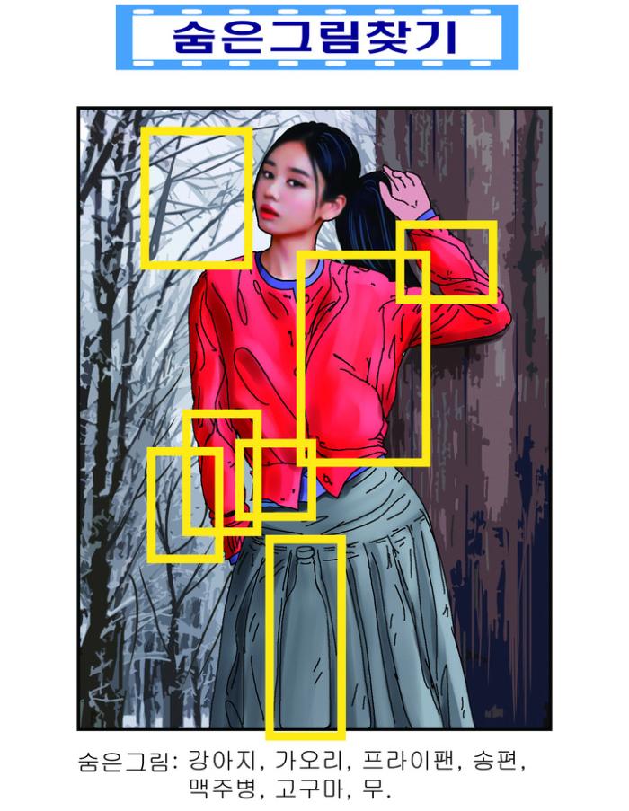 숨은 그림 : 강아지, 가오리, 프라이팬, 송편, 맥주병, 고구마, 무