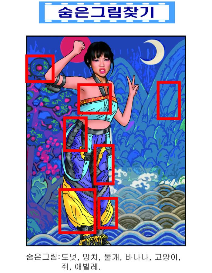 숨은 그림 : 도넛, 망치, 물개, 바나나, 고양이, 쥐, 애벌레