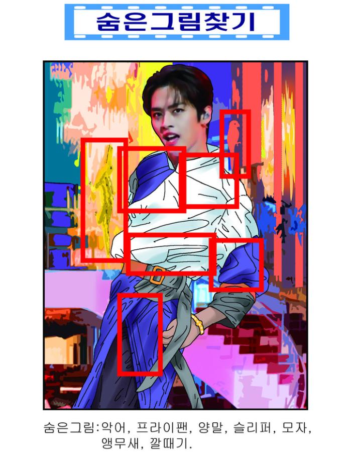 숨은 그림 : 악어, 프라이팬, 양말, 슬리퍼, 모자, 앵무새, 깔때기