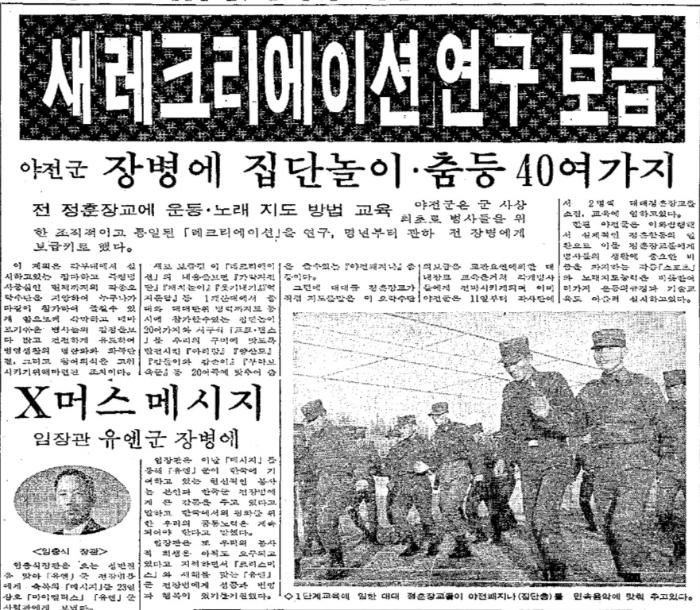‘새 레크리에이션 연구 보급’이란 제목의 기사는 “야전군은 군 사상 최초로 병사들을 위한 조직적이고 통일된 레크리에이션을 연구, 명년부터 관하 전 장병에게 보급하기로 했다”고 보도합니다. 더불어 “이 계획은 각 부대에서 실시하고 있는 잡다하고 특정병사 중심인 현재까지의 각종 오락수단을 지양해 즐길 수 있게 함으로써 삭막하고 메마르기 쉬운 병사들의 감정을 보다 밝고 건전하게 유도하여 병영생활의 명랑화와 화목 단결, 참여의식을 고취시키기 위해 마련된 조치”라고 이유를 밝히고 있습니다.