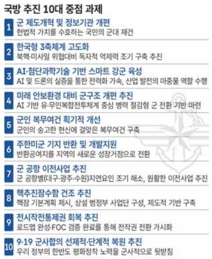 ‘9·19 군사합의 선제적·단계적 복원’에 대해선 “남북 간 신뢰 구축 수준과 군사적 영향을 종합적으로 평가하면서, 9·19 군사합의를 선제적·단계적으로 복원해 한반도 평화 정착을 위한 정부의 노력을 실효적으로 뒷받침하겠다”고 했다.