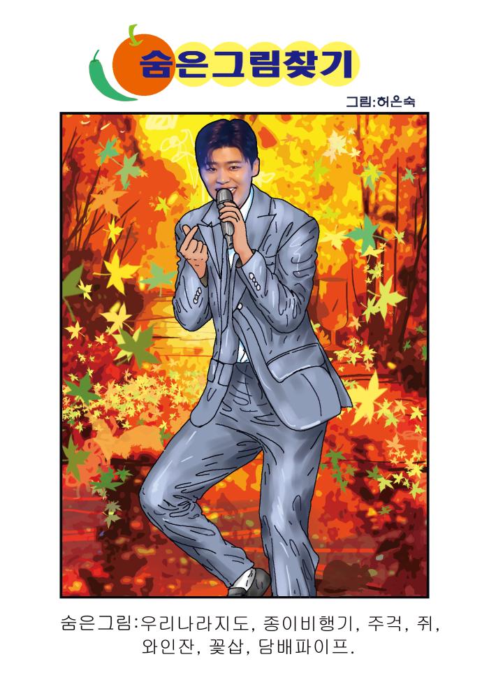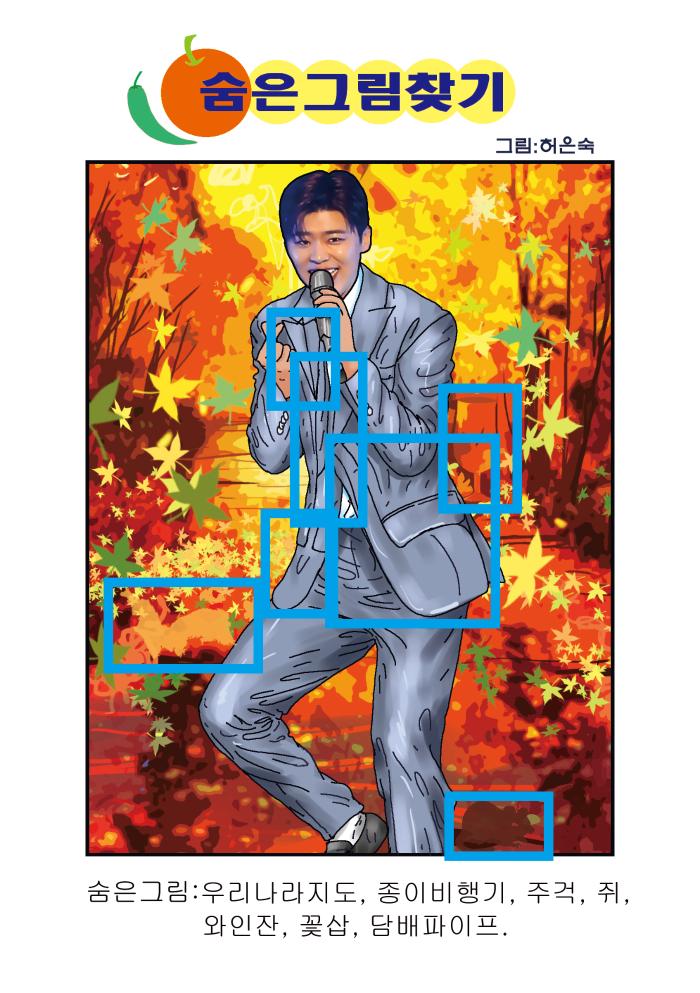 숨은 그림 : 우리나라 지도, 종이비행기, 주걱, 쥐, 와인잔, 꽃삽, 담배파이프