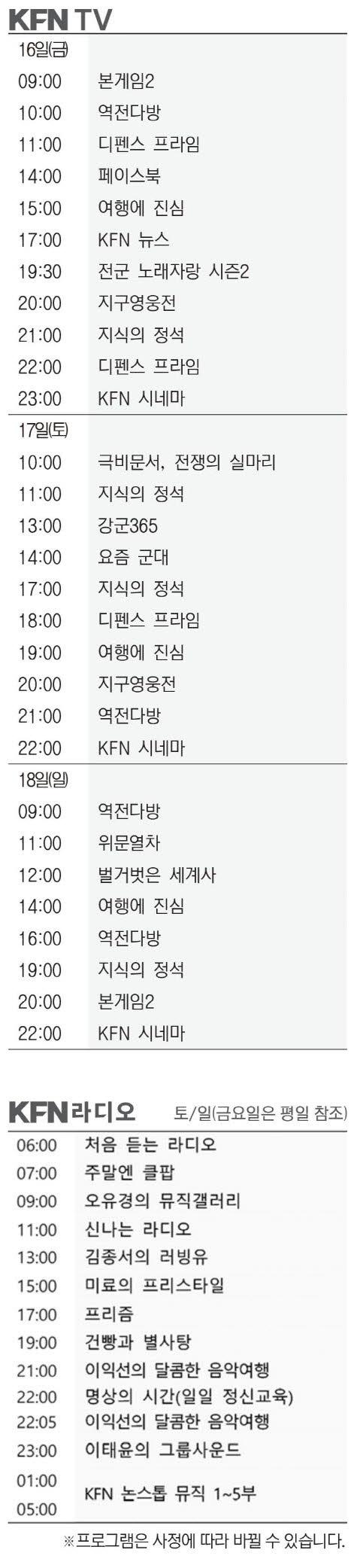 KFN 편성표 (2026년 1월16일)