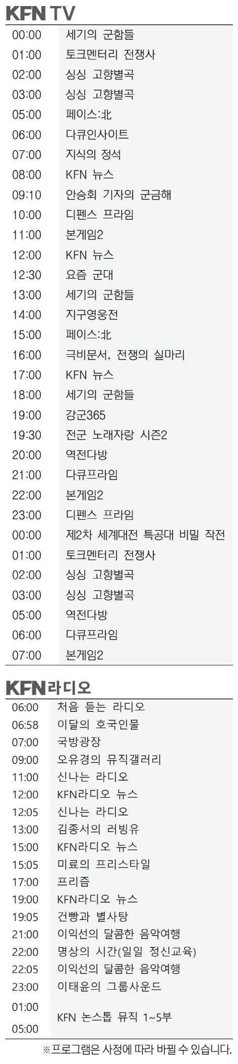 KFN편성표 (2026년 1월20일)