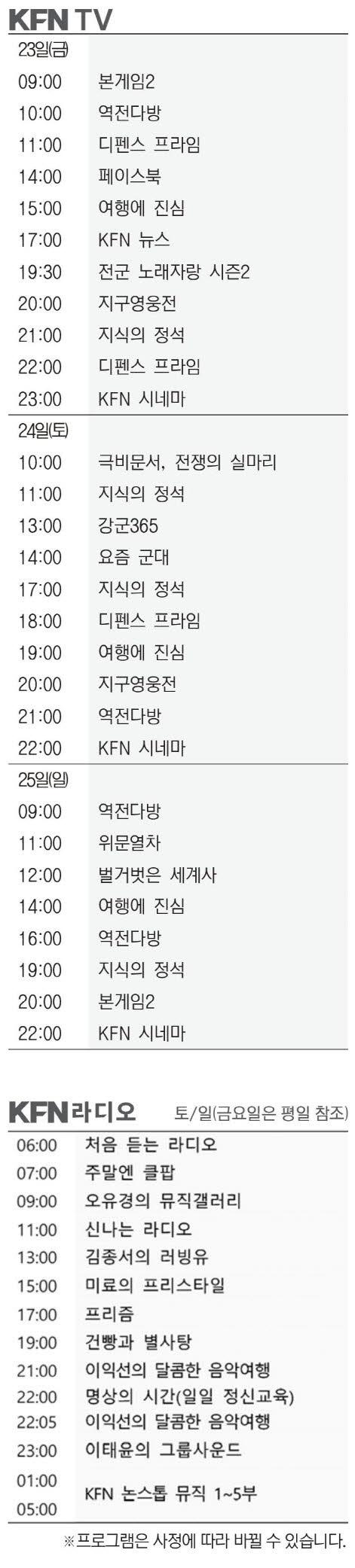 KFN편성표 (2026년 1월23일)