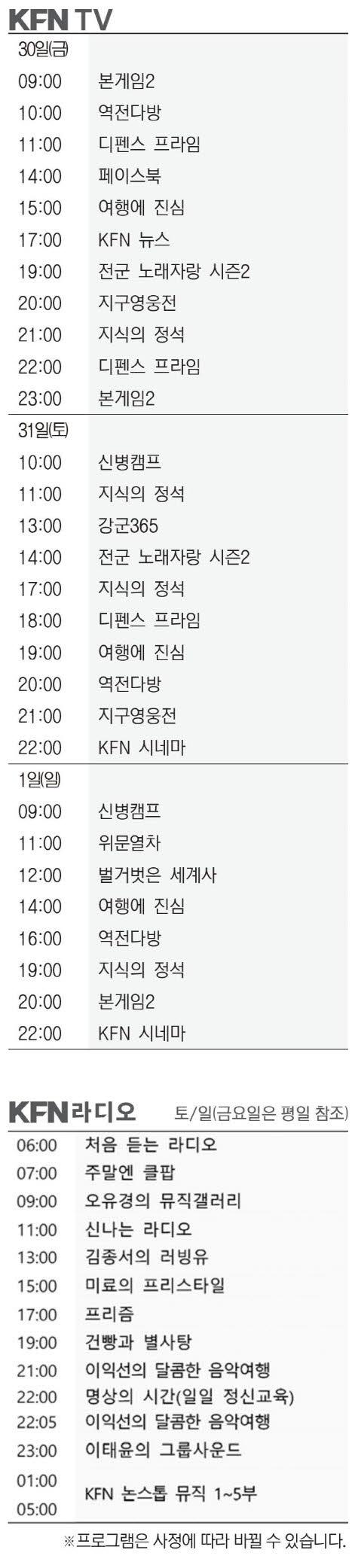 KFN편성표 (2026년 1월30일)