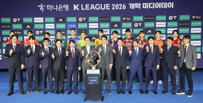 25일 서울 서대문구 스위스 그랜드호텔 컨벤션센터에서 열린 ‘하나은행 K리그 2026 개막 미디어데이’에서 감독과 선수들이 기념촬영을 하고 있다. 2026시즌은 오는 28일 인천축구전용구장에서 열리는 인천 유나이티드와 FC서울의 라이벌전으로 대장정을 시작한다. 연합뉴스