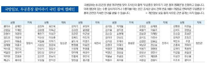 국방일보는 6·25전쟁 발발 76주년을 맞아 조사단과 함께 ‘무공훈장 찾아주기 국민 참여 캠페인’을 진행하고 있습니다. 아래 명단에 있는 수훈 당사자이거나 수훈자를 아는 분은 조사단 공식 전화 번호 1661-7625로 연락하면 무공훈장 수훈에 관련된 자세한 안내를 받을 수 있습니다.※ 개인정보 보호 등의 사유로 군번 공개는 하지 않습니다.