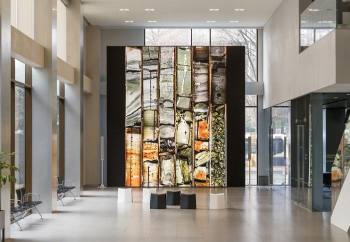 ‘18 Cores’는 따뜻한 환경인 미 캘리포니아 솔턴호 지역의 지층을 다룬 작품이다. 1985~1986년 사이 채취된 암석 코어 이미지를 결합해 18개의 지층 단면을 실을 엮어 만드는 공예를 일컫는 태피스트리처럼 배열했다. 지하 깊숙한 곳의 풍경과 지질 흔적을 몰입감 있게 보여 준다.