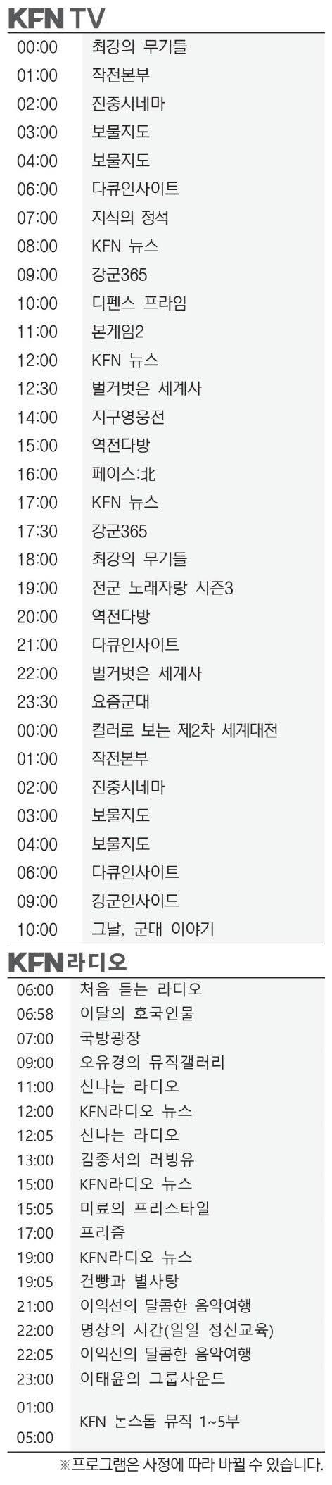KFN편성표 (2026년 3월31일)