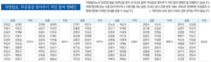 국방일보는 6·25전쟁 발발 76주년을 맞아 조사단과 함께 ‘무공훈장 찾아주기 국민 참여 캠페인’을 진행하고 있습니다. 아래 명단에 있는 수훈 당사자이거나 수훈자를 아는 분은 조사단 공식 전화 번호 1661-7625로 연락하면 무공훈장 수훈에 관련된 자세한 안내를 받을 수 있습니다.※ 개인정보 보호 등의 사유로 군번 공개는 하지 않습니다.