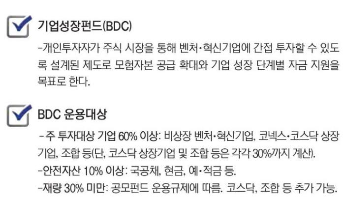 지난 3월부터는 분위기가 달라졌습니다. 정부가 ‘기업성장펀드(BDC·Business Development Company)’ 제도를 본격적으로 도입하면서 비상장기업 투자 시장이 일반투자자에게도 열리기 시작한 것입니다. BDC는 개인투자자가 주식 시장에서 비상장 벤처기업에 직접 투자할 수 있는 공모펀드입니다. 쉽게 말해 비상장기업에 투자하는 공모펀드 중 상장까지 하는 구조인 셈입니다.