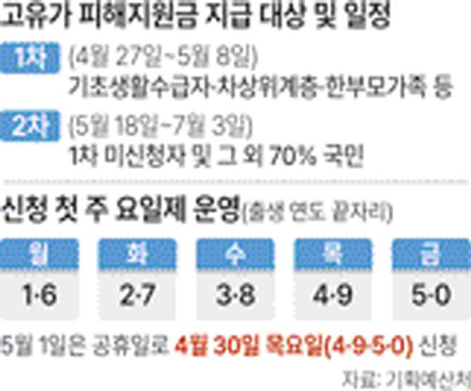지원금 신청과 지급은 1차와 2차로 나눠 운영된다. 기초생활수급자, 차상위계층·한부모가족은 1차 지급 기간인 4월 27일~5월 8일 온·오프라인으로 신청해 지급받을 수 있다. 이들 중 1차 기간 내 피해지원금을 신청하지 못한 사람과 그 외 70%의 국민은 2차 신청·지급 기간인 5월 18일~7월 3일 신청과 수령이 가능하다.