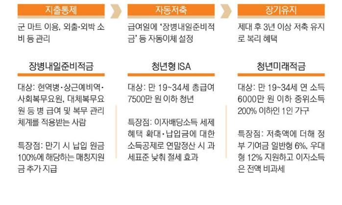 군대에서 하루 대부분을 주식·가상자산 투자에 매달리거나 부동산 공부를 하기는 쉽지 않을 것입니다. 이런 때일수록 목돈 마련에서 ‘자동화’가 필수란 평이 나옵니다. 이를 위해선 ‘지출통제·자동저축·장기유지’란 세 가지 저축 핵심 요소를 기억해야 합니다.