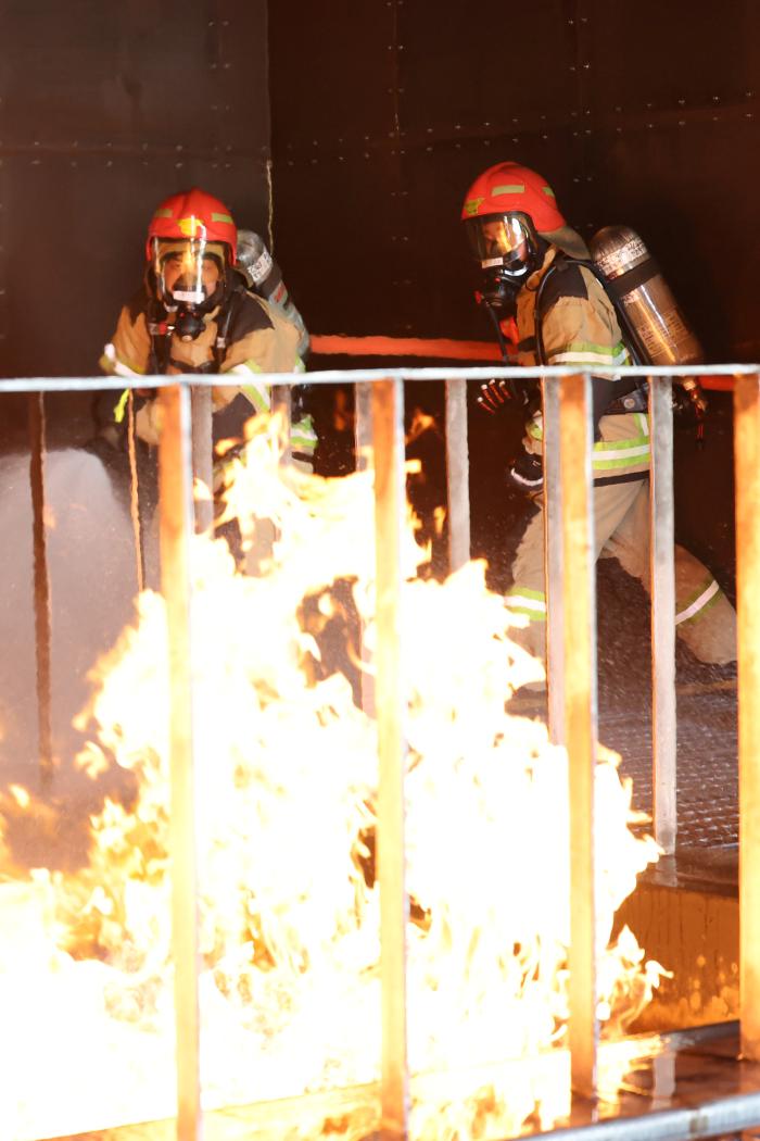 가장 먼저 마주한 곳은 2개소로 나뉜 화재 훈련장이었다. 비교적 중·소형 화재가 발생하는 취사장 가스레인지 화재 상황부터, 유류를 많이 사용하고 고열이 발생해 대형 화재로 번질 위험이 매우 높은 기관실 상황까지 완벽하게 재현됐다.